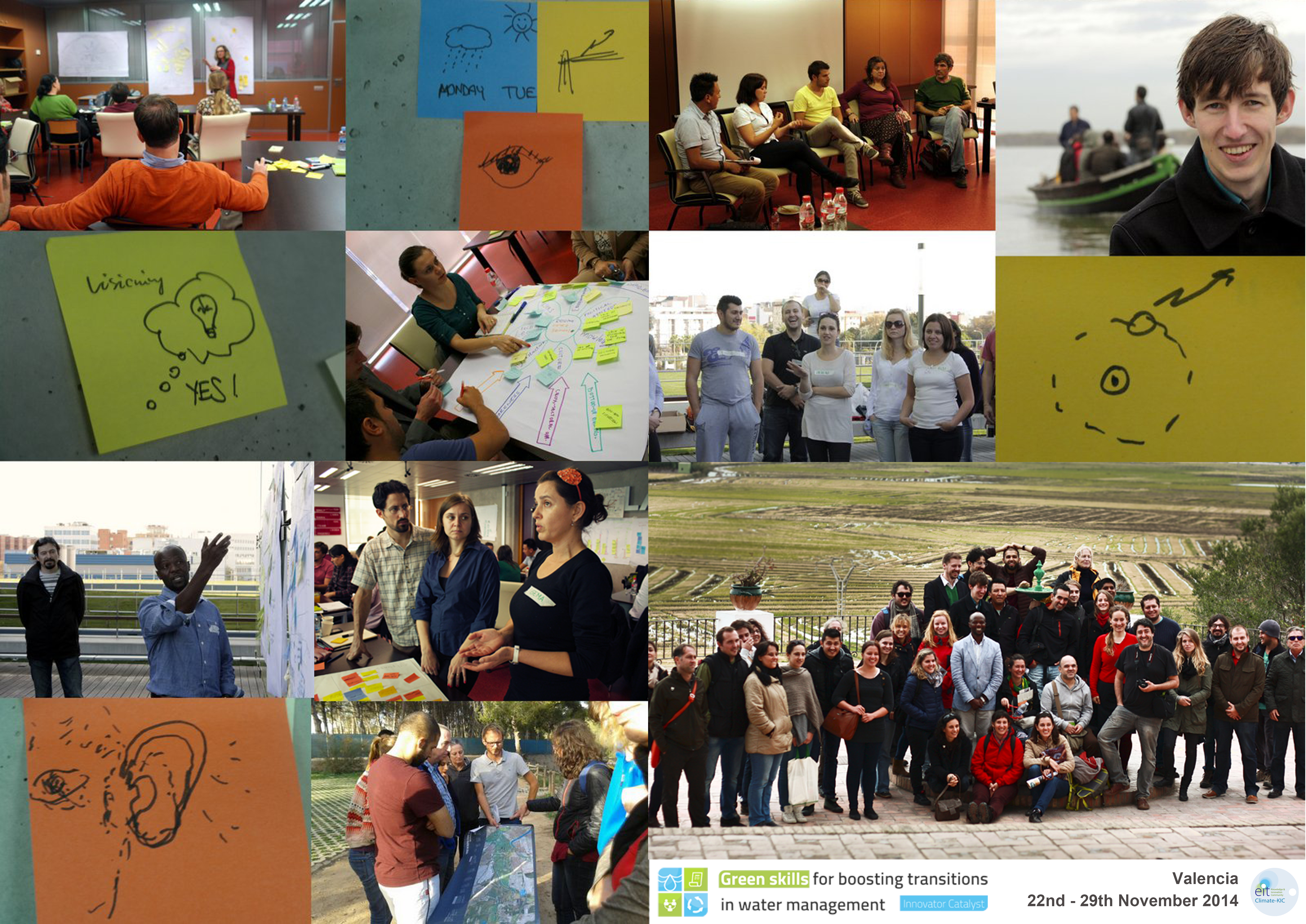 Climate-KIC offered an eight day coached sustainability transitions course for experienced environment and water management professionals, held in Valencia (Spain) from 22nd until 29th November 2014. It was designed to provide the key competencies and capabilities to be an innovator in the broad sense of this term. More than 35 people, from 15 different countries, were working on ‘Green skills’ in a programme designed to upgrade professional competences to face climate and sustainability challenges. The principal novelty of the course was to introduce horizontal and cooperative methods of working, involving low-profile hierarchies and greater autonomy. Hence, participants were collaborating hand-by-hand with international, regional specialists and problem owners related with climate change within a “project meeting” atmosphere.