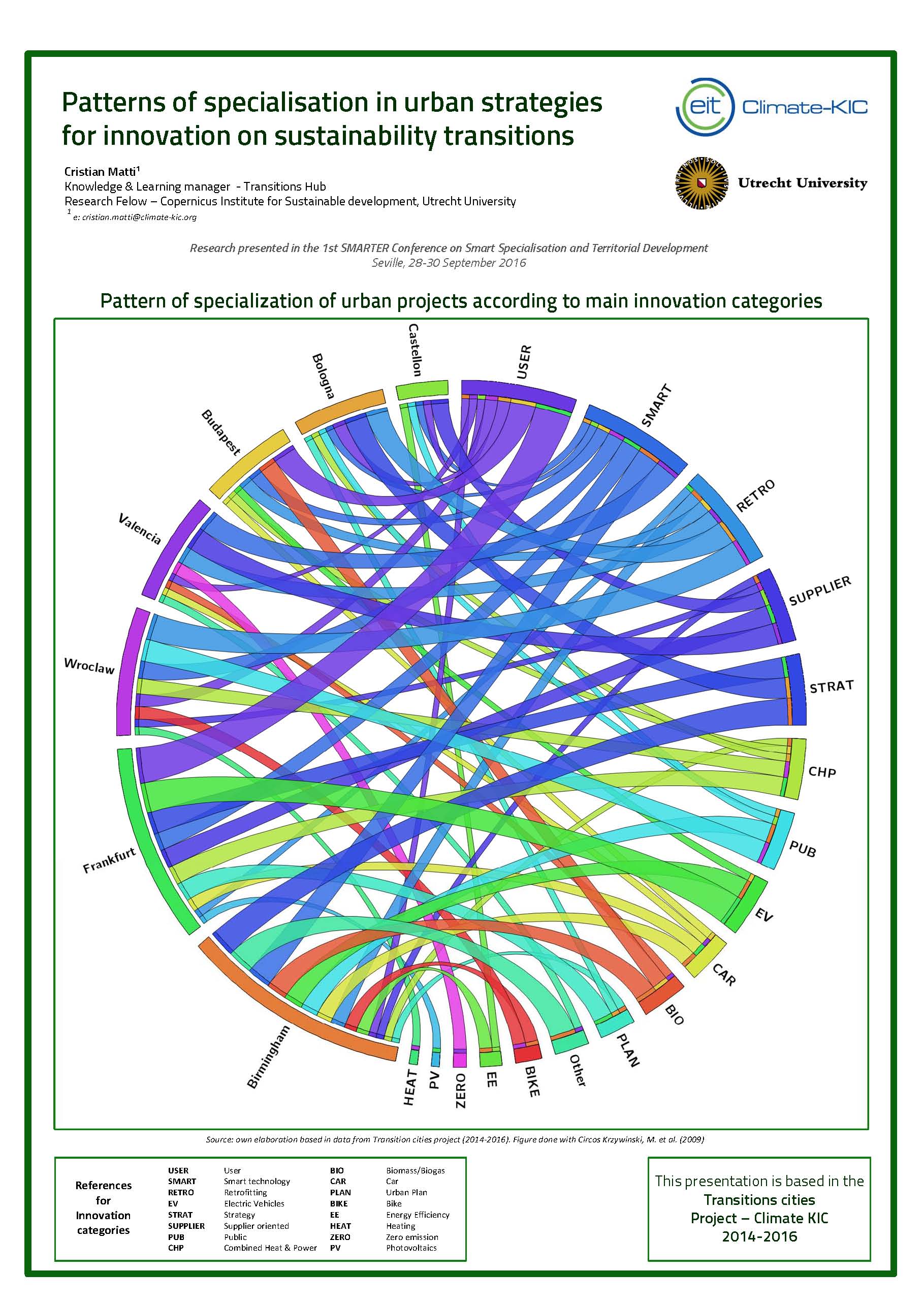 The pattern of specialization in the cities of the Transition Cities project is analysed by applying the Circos (Krzywinski et al., 2009) data graphics tool for structural studies. The exercise seeks to facilitate the analysis of specialization evidence from patterns in the data.